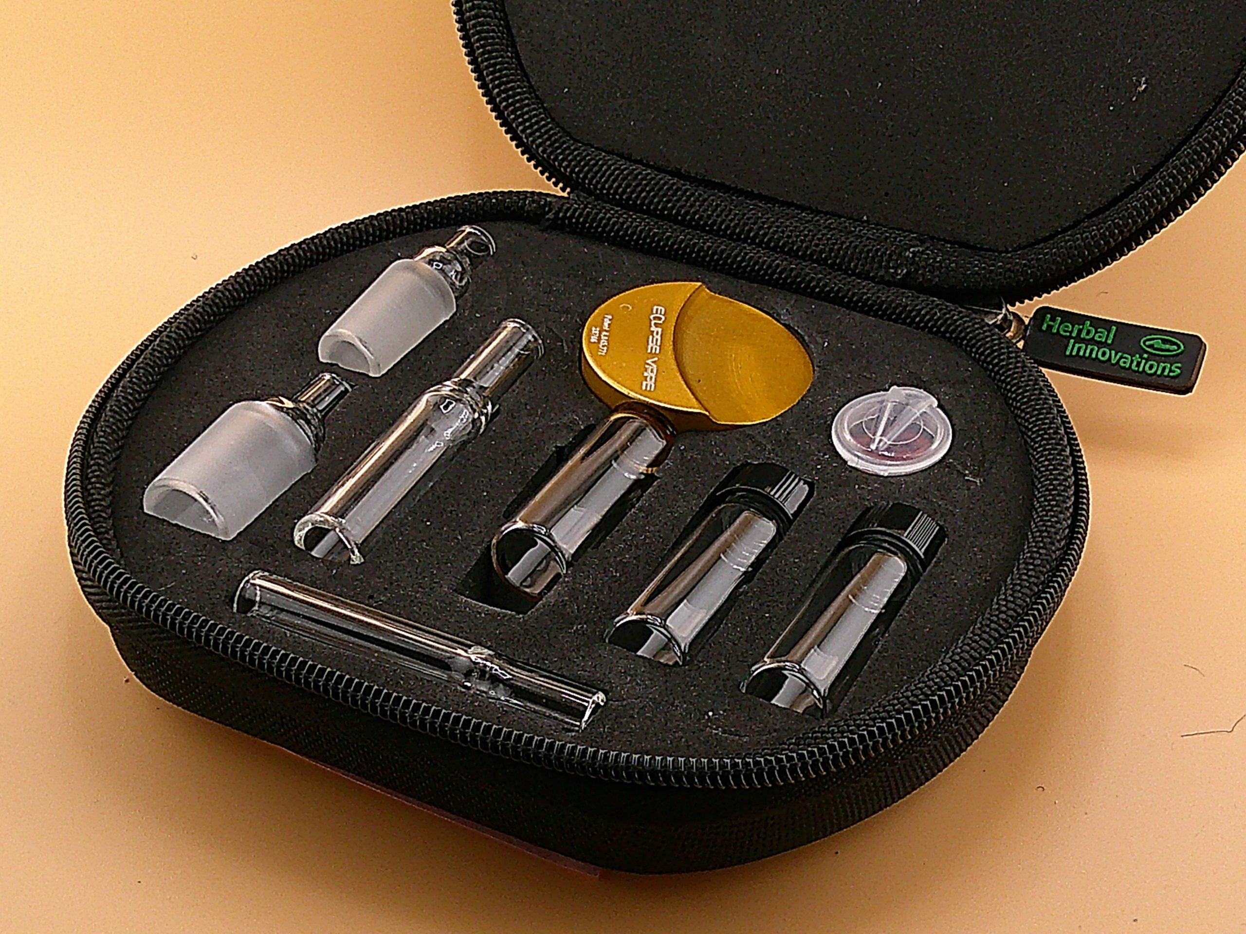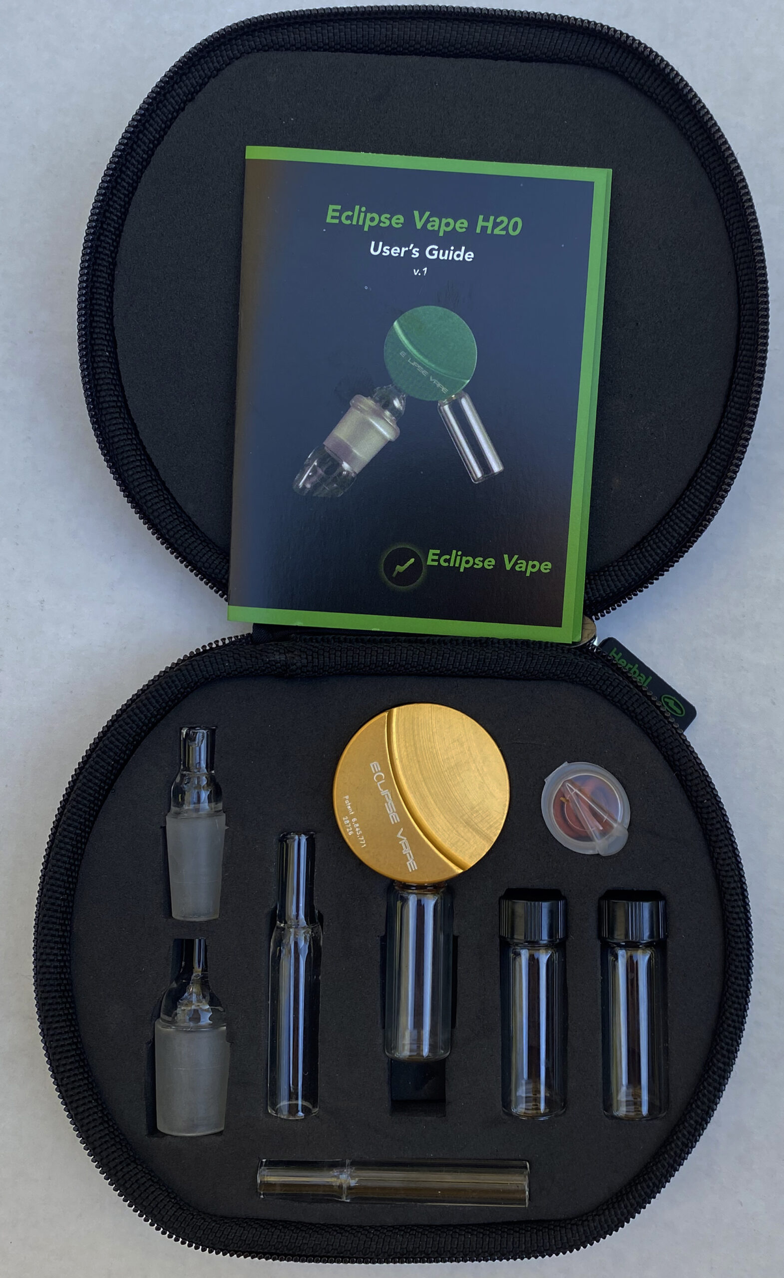 Gold Eclipse H2O includes 3 Vials, 14mm&18mm GG and slide adapters, extra o-rings all inside a Zipper case.
