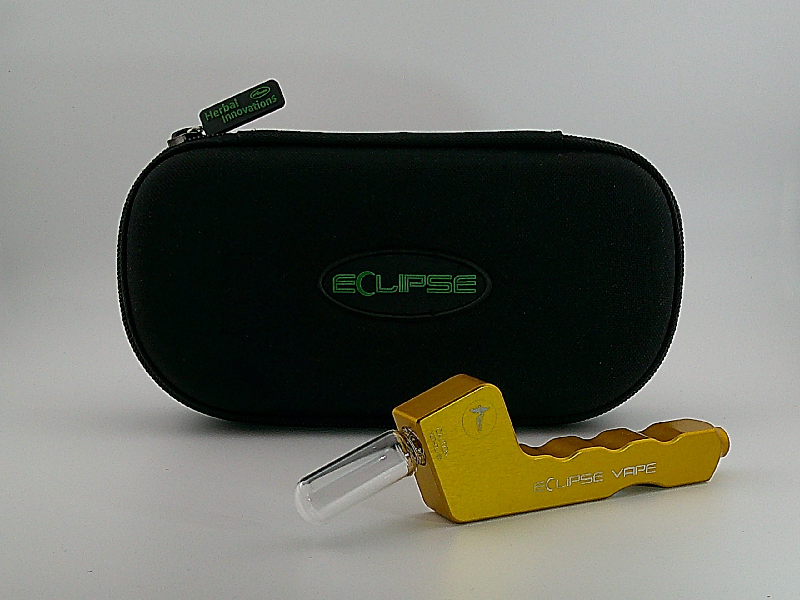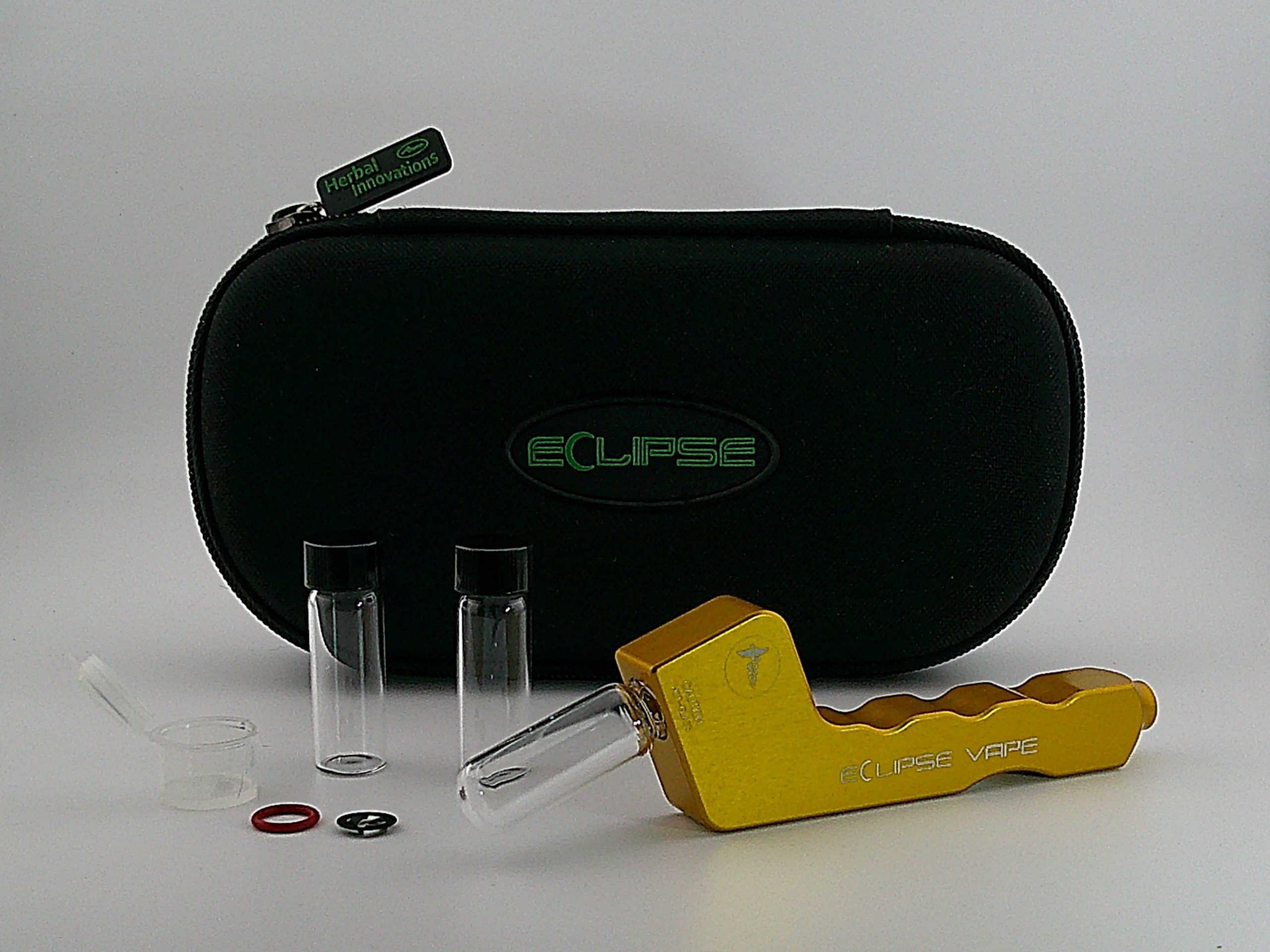 Gold Eclipse Vape Pipe includes  Vials, extra o-rings and screens all inside a Zipper case.