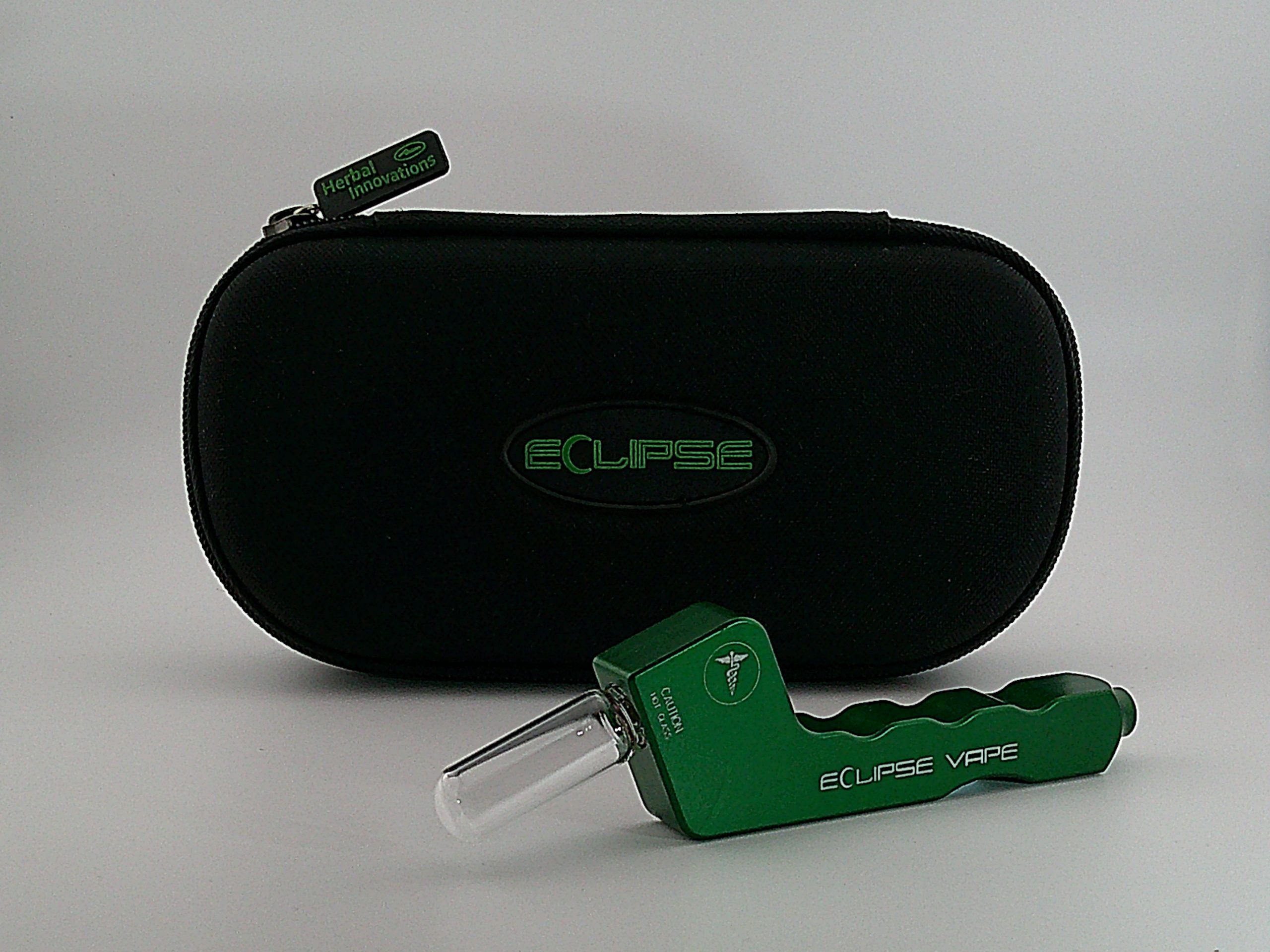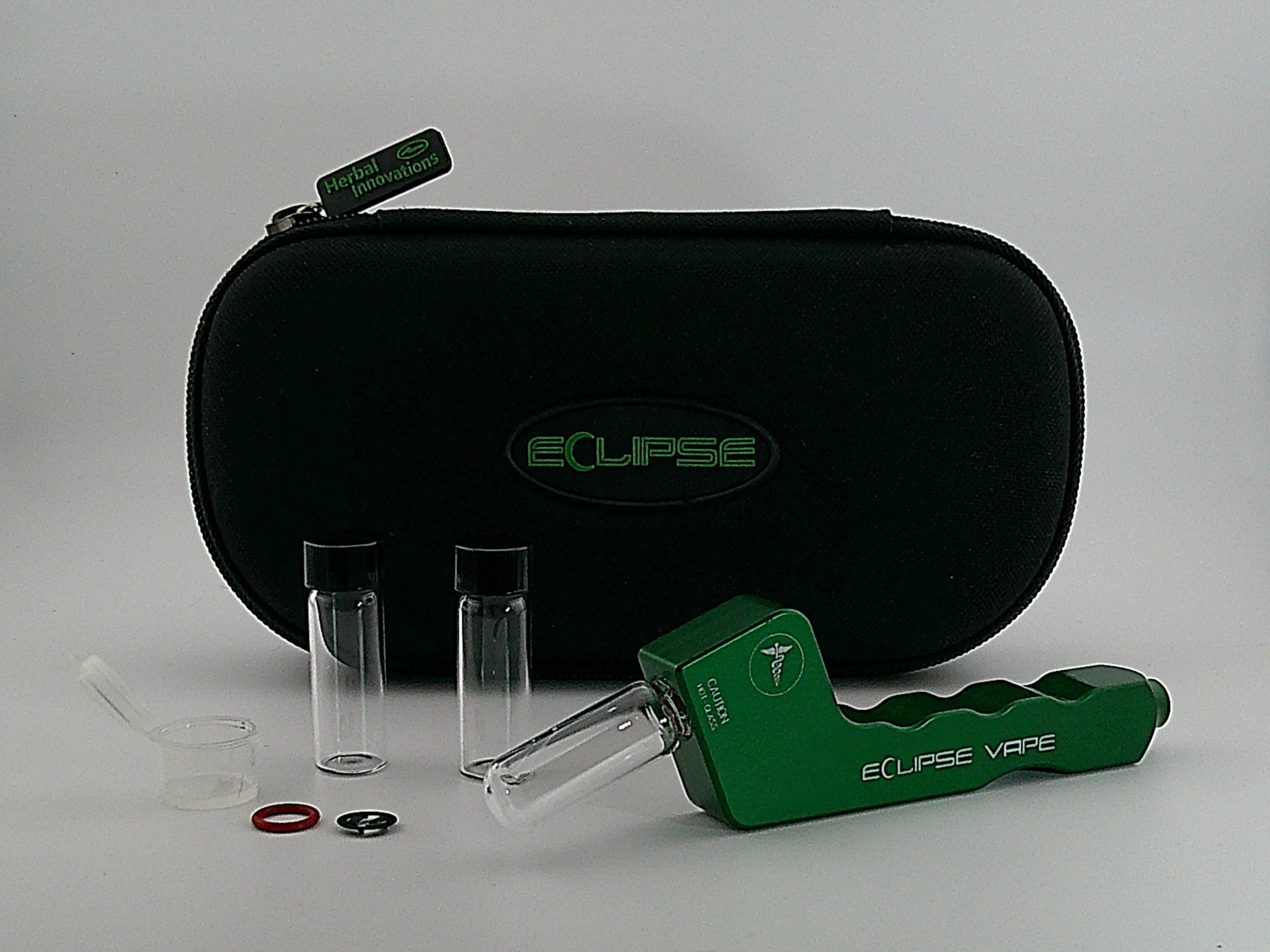 Green Eclipse Vape Pipe includes 4 Vials, extra o-rings and screens all inside a Zipper case.