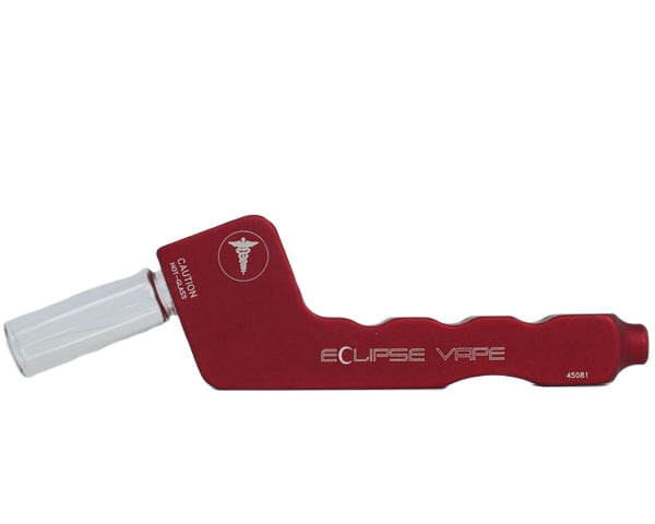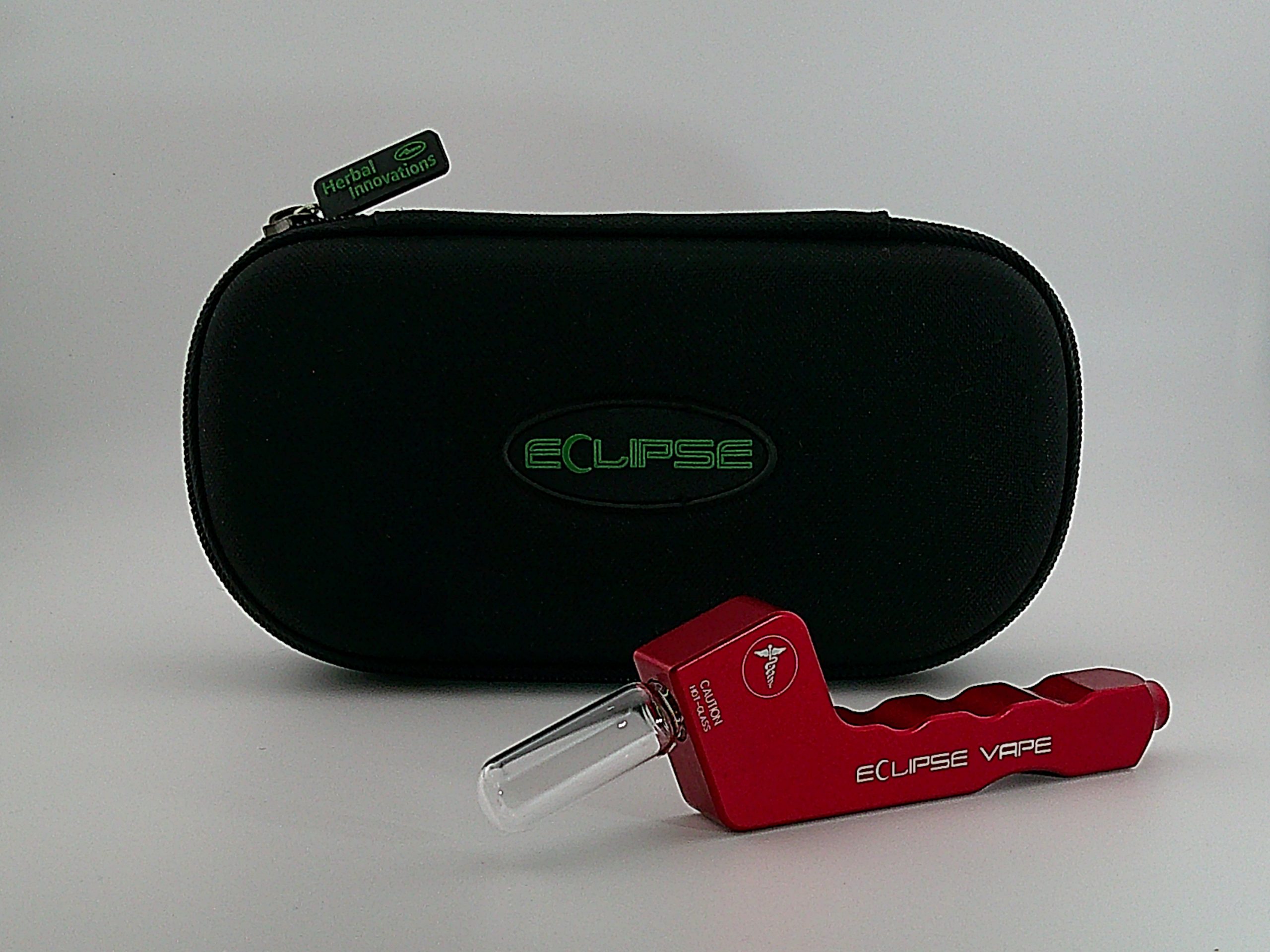 Red Eclipse Vape Pipe includes 4 Vials, extra o-rings and screens all inside a Zipper case.